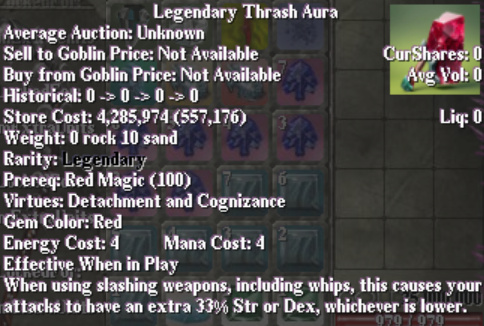 5/11/2025 The Thrash Aura effect has been reworked. It is now more powerful in base %, but it only increases Str or Dex, whichever is lower. This will be more beneficial to more balanced stat builds.