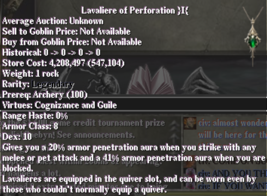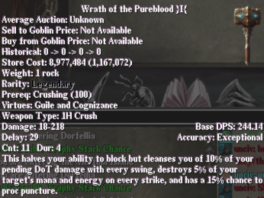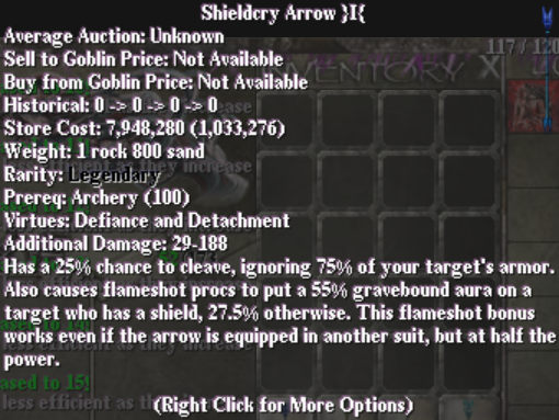 It's time for some Recompense, don't you think? New skill pending: When hit with an arrow, this skill provides a percent chance up to the value of your attacker’s bow delay to choose a random gem from your pouch, and if that gem has a DD component, to immediately cast it on the attacker without cost. This Legendary skill requires 100x normal experience to level, is not affected by PK or boon bonuses, and requires a great amount of luck for each skill up. Retained through reroll and permanent death.